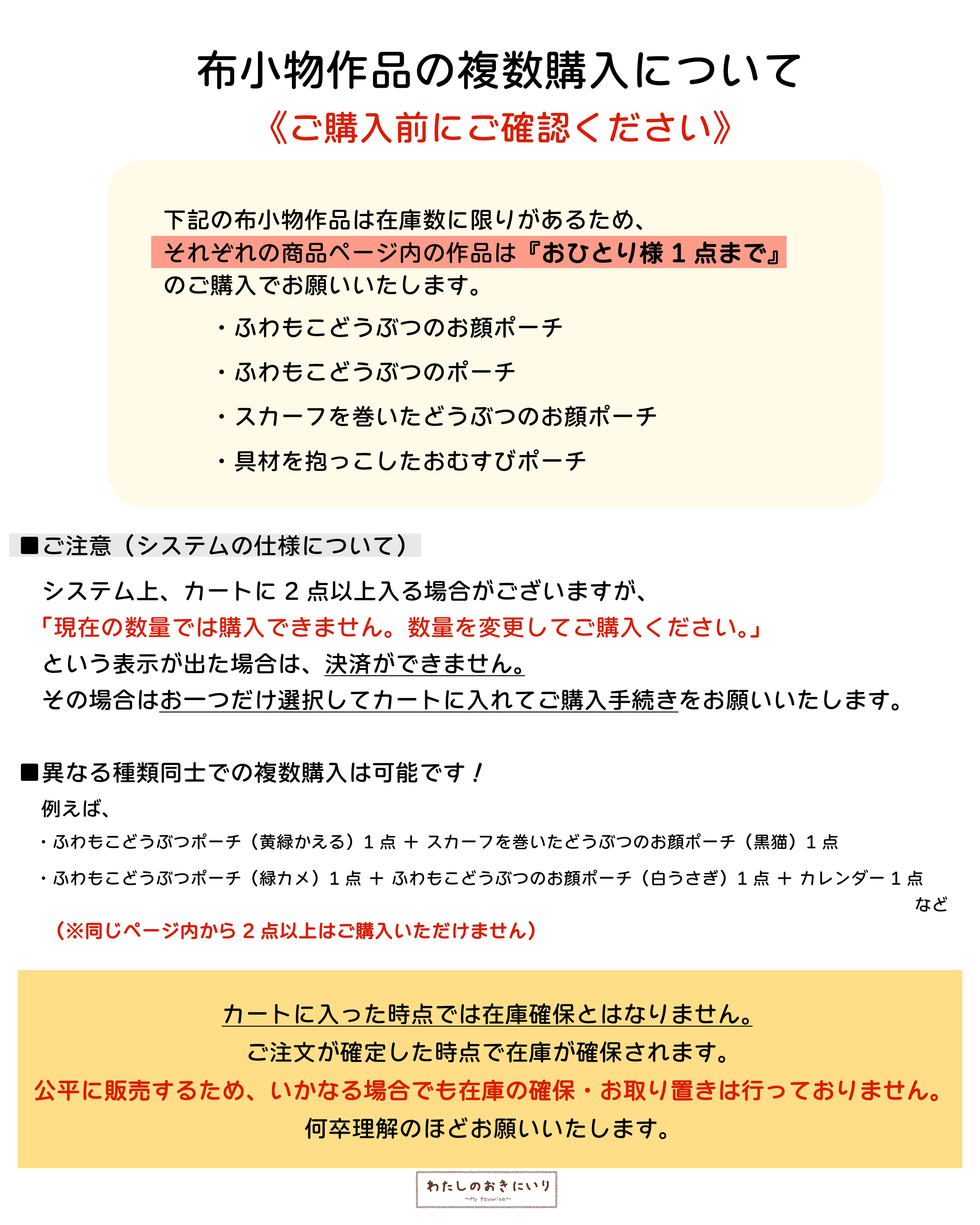 下記の布小物作品は在庫数に限りがあるため、各商品ページ内の作品は《おひとり様1点まで》のご購入でお願いいたします。