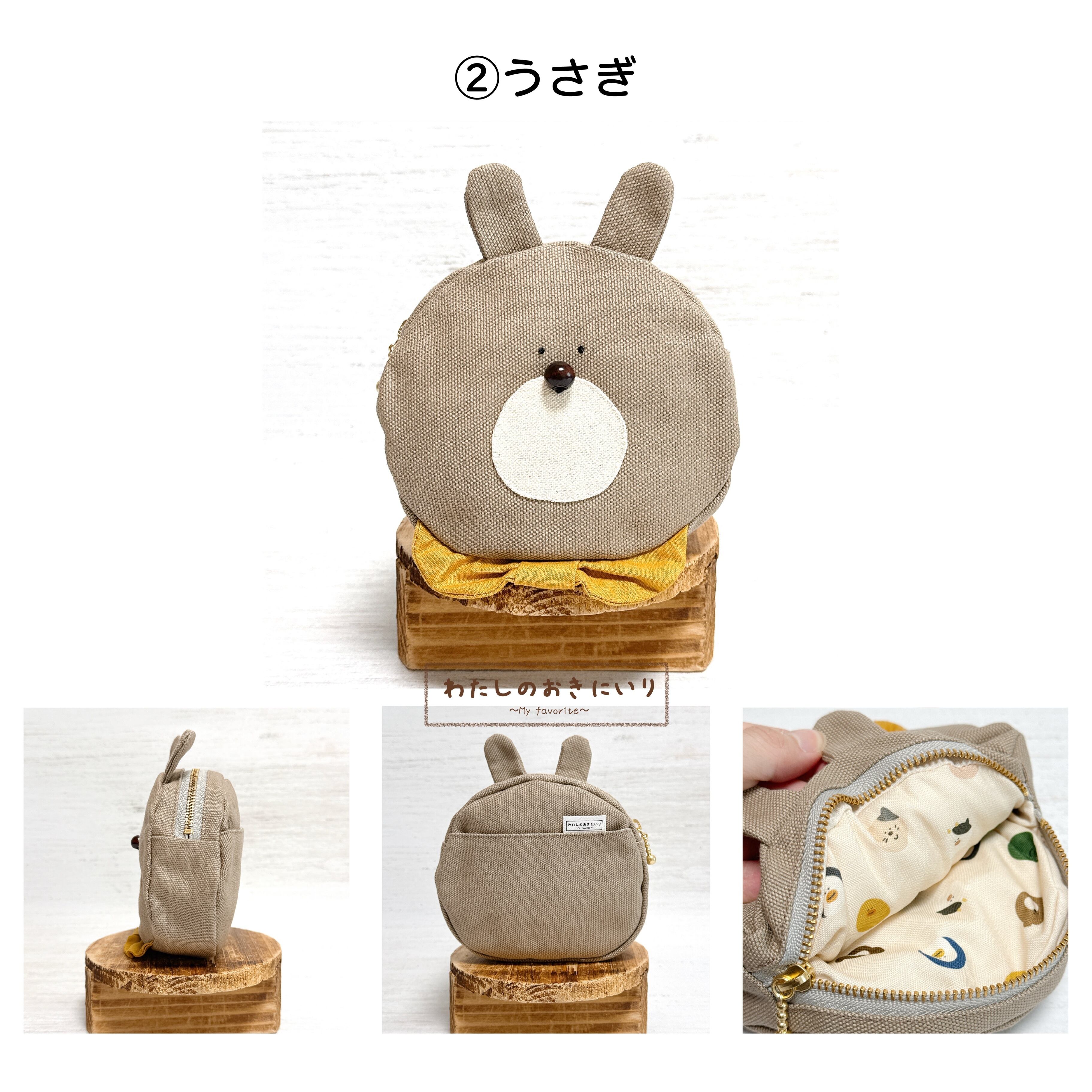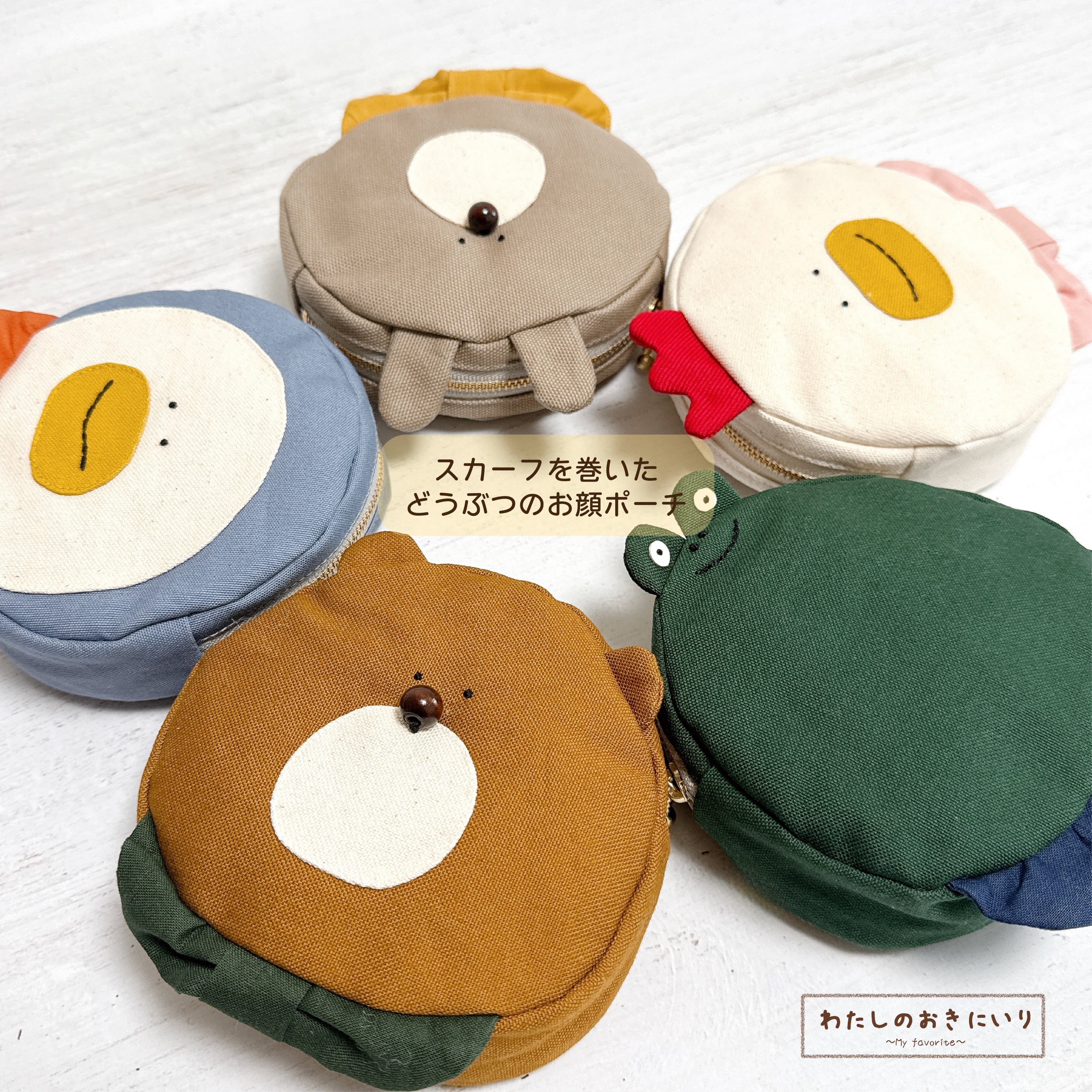 スカーフを巻いたどうぶつのお顔ポーチ